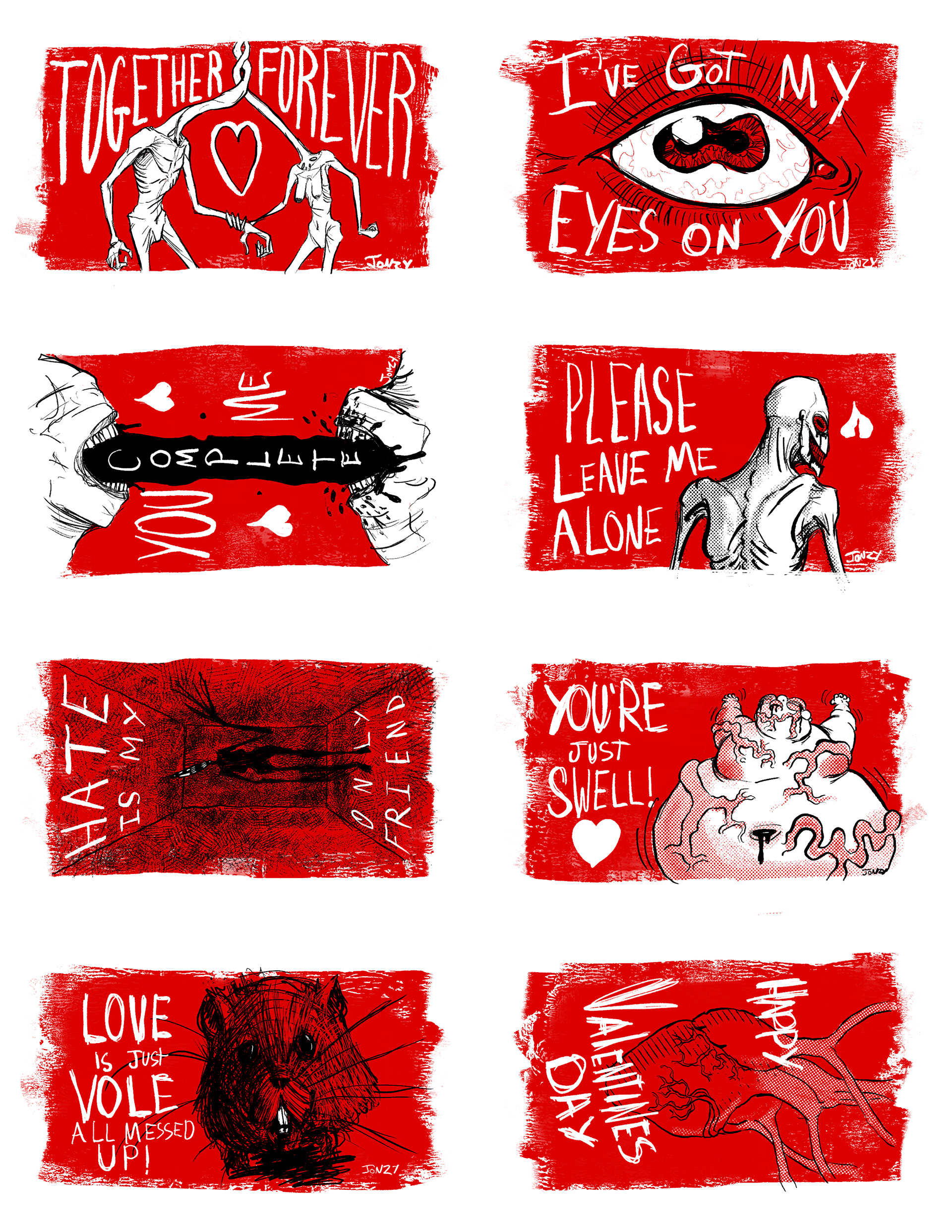 It is almost upon us and it resonates with the most unpleasant parts of myself. To aid myself and others on this day I have created a printable set of 8 cards to give to your most beloved people in your life. All you have to do is print it out and Bam. The print is made for a printer that can print double sided but obviously if your printer cant to that then don't even worry about it. Just cut them into 8 equal cards. the cut lines are on one side to make it easy on you.